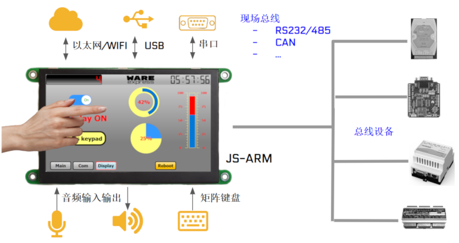 JS-ARM计算机由ARM核心板,显示和控制相关的硬件电路组成,可最大限度降低用户人机交互界面硬件开发工作量,同时JS-ARM板载了丰富的硬件资源和扩展接口,可方便连接工业现场设备,访问网络,操作USB设备,音频输入输出,甚至直接采集和控制用户电路。JS-ARM目前有简化型,显控型和专业型。不同类型针对不同应用场合设计,搭配的硬件接口配置各异,但软件开发和接口完全保持一致。显控型主要针对工业显示控制应用场合而设计,可轻松替代传统串口屏。